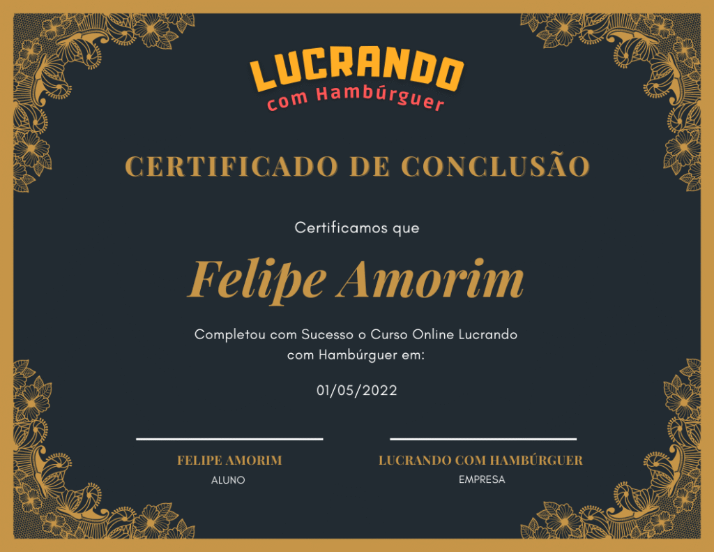 Após finalizar todas as aulas do curso você vai ter acesso a um certificado de conclusão atestando a sua capacitação na produção de Lucrando com Hambúrguer.